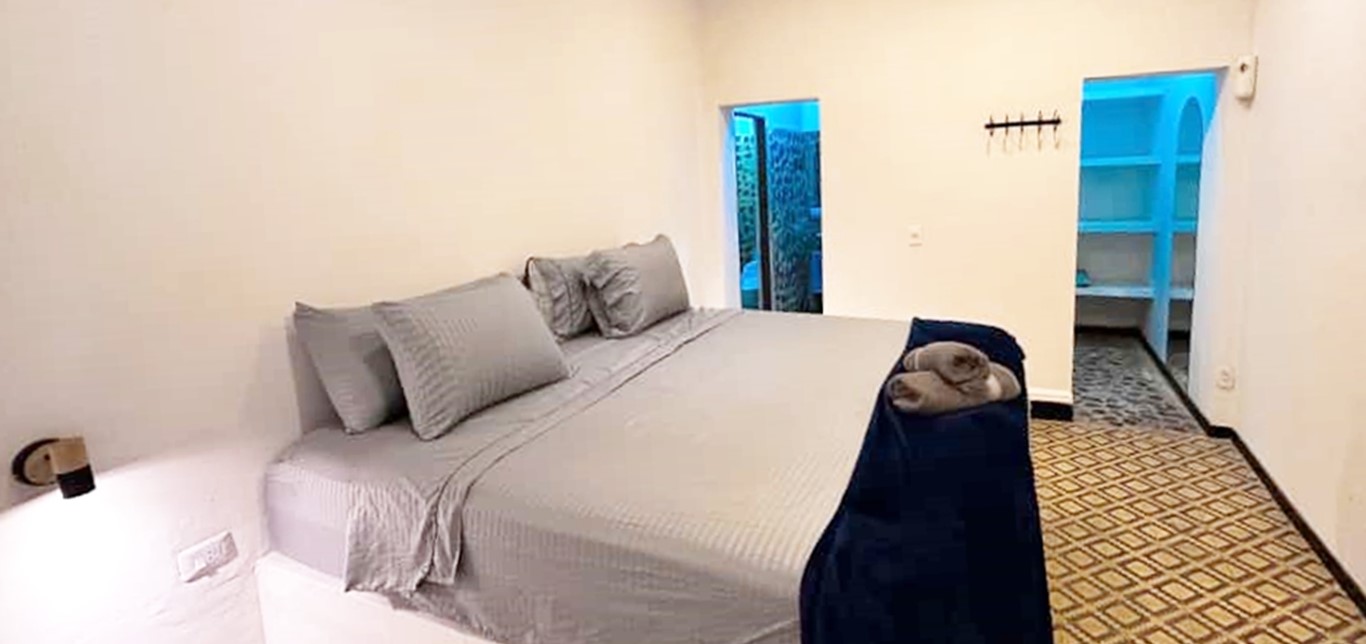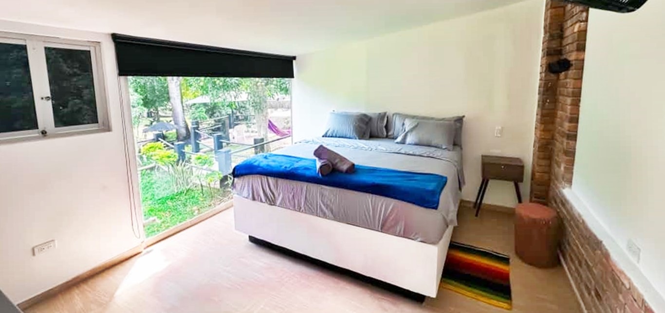 Habitación externa a la casa principal con dos camas dobles. Baño privado, ventilador y closet.